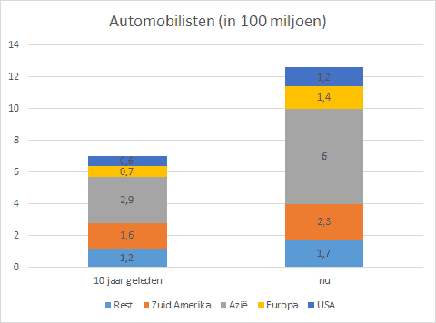 Vraag: Met hoeveel meer nam het aantal automobilisten in Azië toe in de afgelopen 10 jaar ten opzichte van Europa?